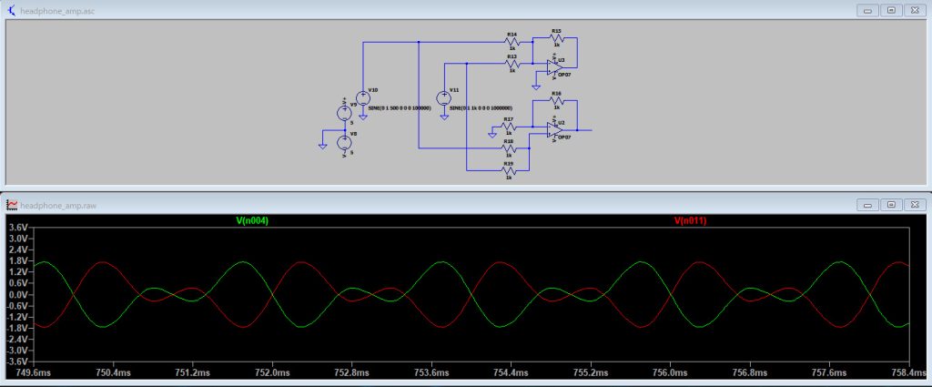 なお、赤色が非反転増幅回路で、緑色が反転増幅回路です。ちゃんと反転していますね。
