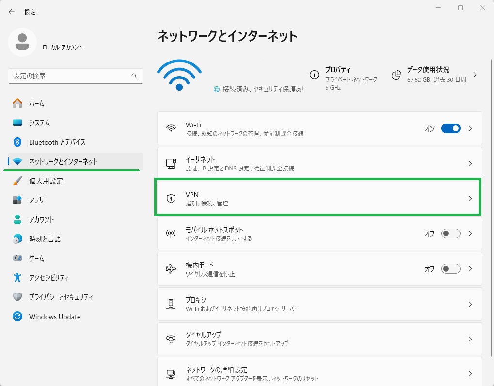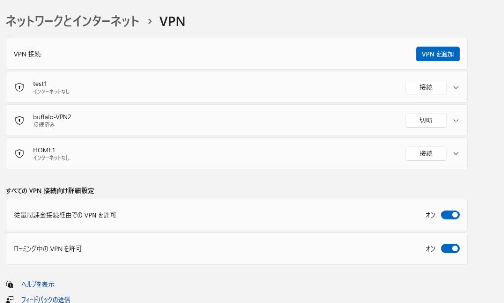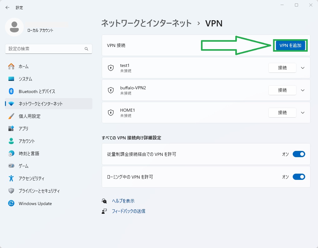 Windowsの設定画面を開き、ネットワークとインターネットからVPNを選択します。