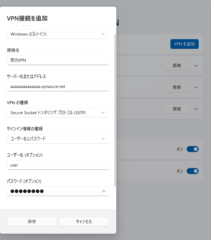 こんな画面になるので、接続設定名はわかりやすいものに変更します。ホスト名はvpnazure.netで終わるアドレスを指定します。ポート番号は443です。ユーザー認証には、VPNサーバーを作ったときに作ったアカウント情報を入力します。