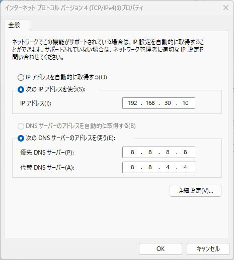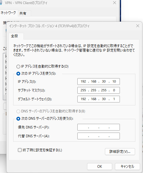 接続が完了すると、下のように現在のステータスが表示されます。今回の場合だと、192.168.30.10が割り当てられたということがわかります。ということで接続完了です。