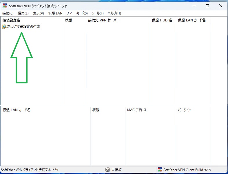 下の仮想LANカードのところに、先程作成した仮想LANが表示されます。もう一度、新しい接続設定の作成を選択します。