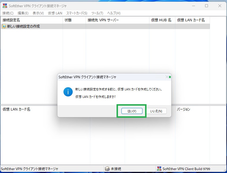 仮想LANカードを作成しろと出てきますので、はいを押します。(今後VPNに接続すると、この仮想LANカードで通信することになります)