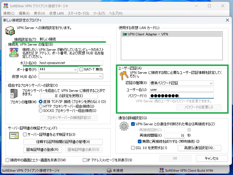 接続名はわかりやすい名前にしておくと良いと思います。サーバー名またはアドレスは、SoftEtherVPNのvpnazure.netで終わるアドレスを指定します。