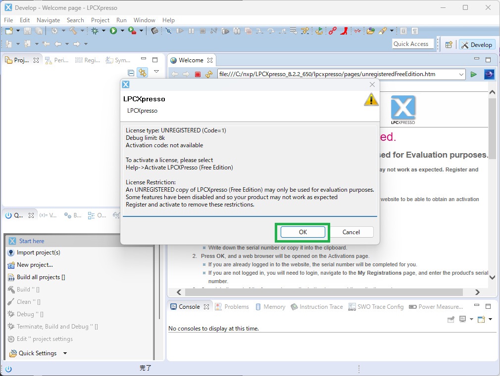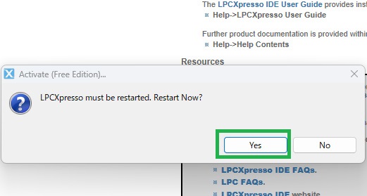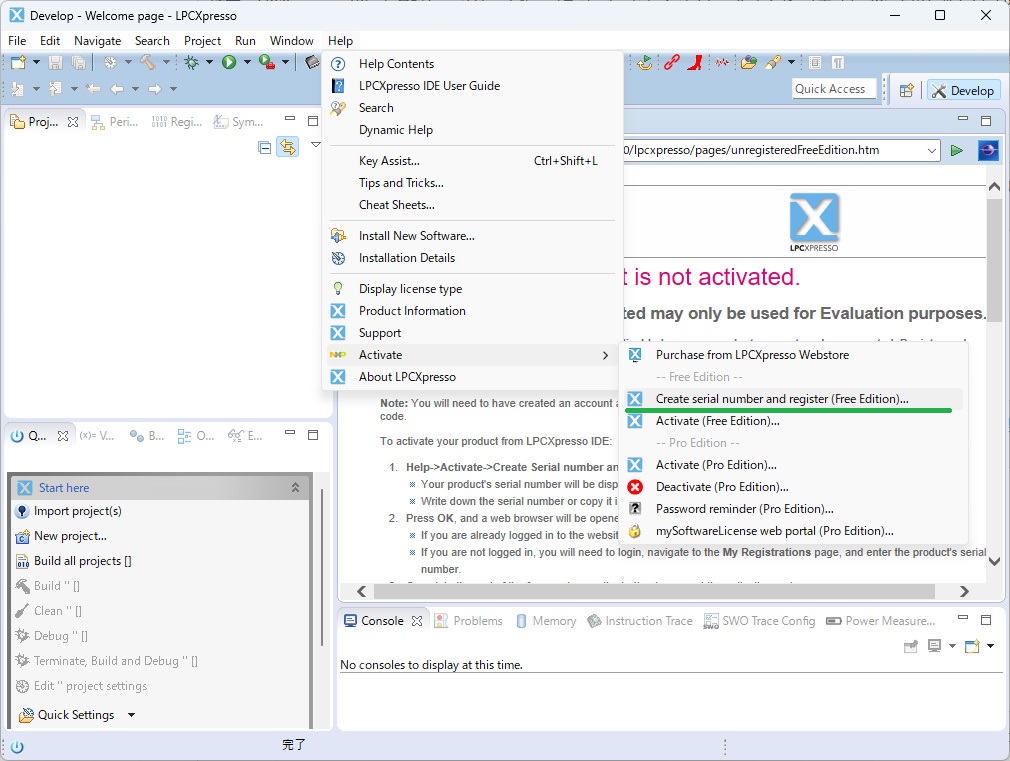 LPCXpressoに戻り、 Help → Activate → Activate(Free Edition)… をクリック