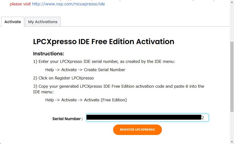 さっき出てきたシリアルナンバーを入力して、REGISTER LPCXPRESSOを押します。