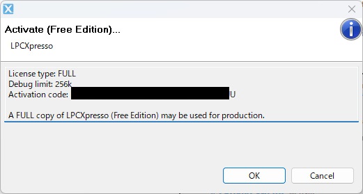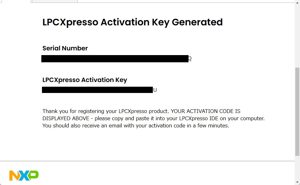 そうすると、LPCXpresso Activation keyが出てくるので、これをコピー