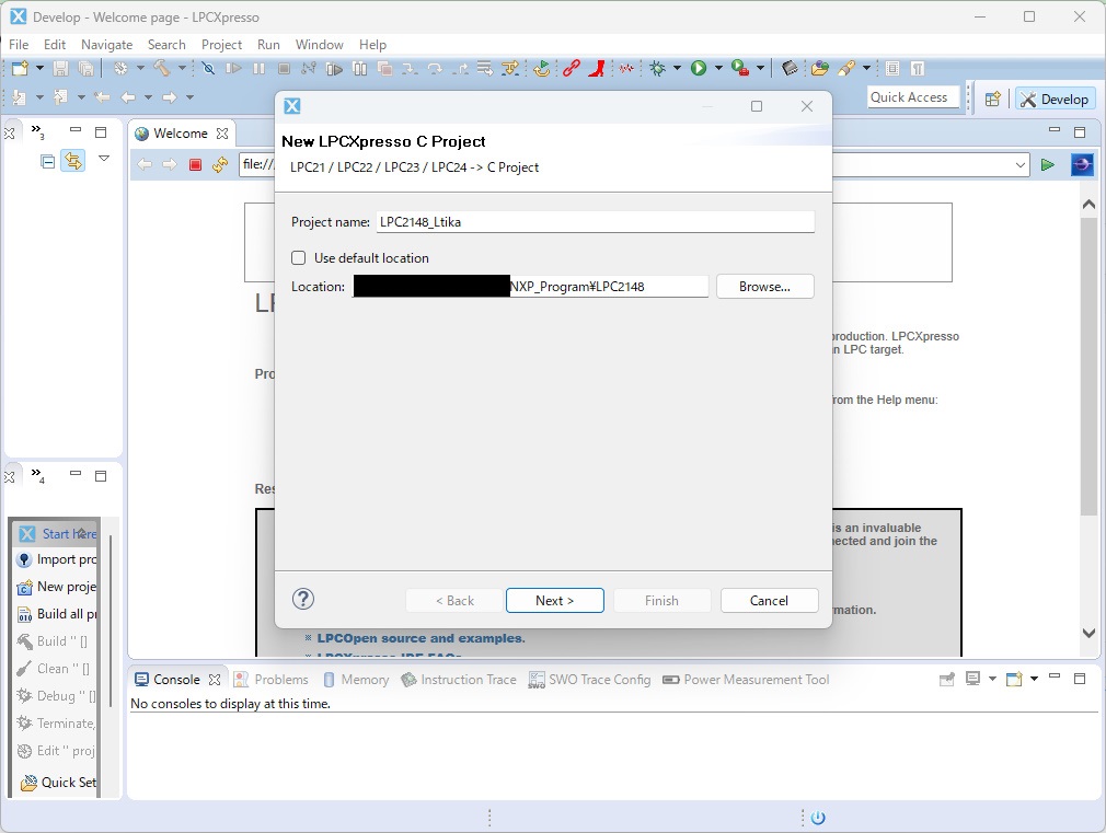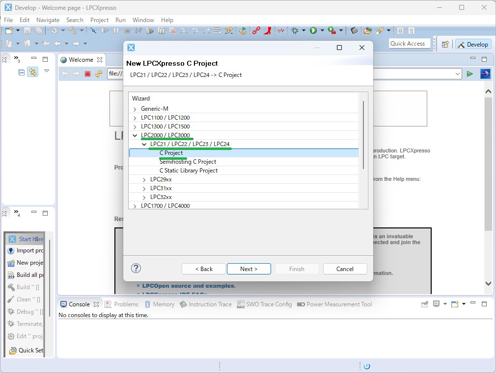 今回は、LPC2000/LPC3000 → LPC21/LPC22/LPC23/LPC24 → C project を選択して Next
