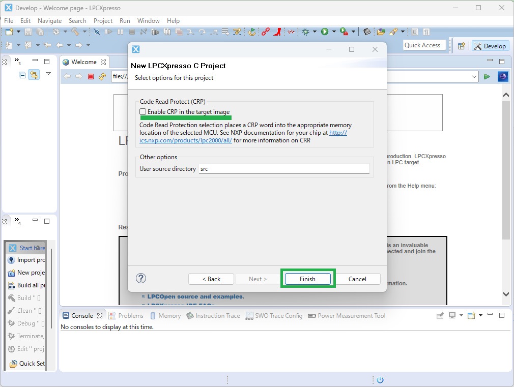 Code Read Protect(CRP)のチェックを外して、Finishを押します。(正直やらなくてもいいかもしれませんが、今回はチェックを外しておきます)
