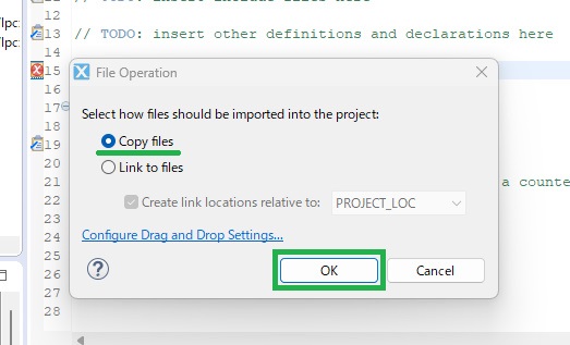 今回は面倒だったのでsrcフォルダにD&Dしました。Copy Filesを選択し、OKをクリック。