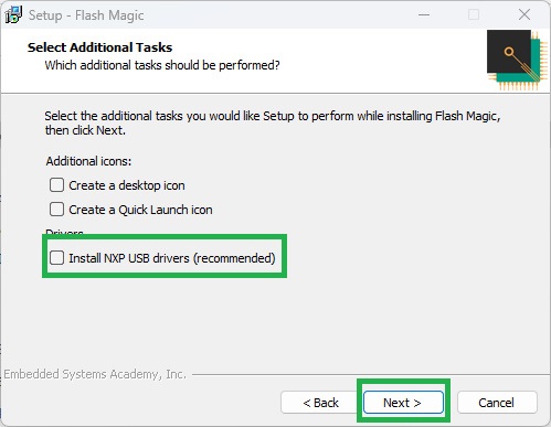個人的にここ注意なのですが、Install NXP USB Driversはチェックを外してください