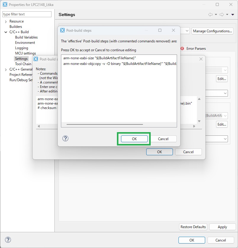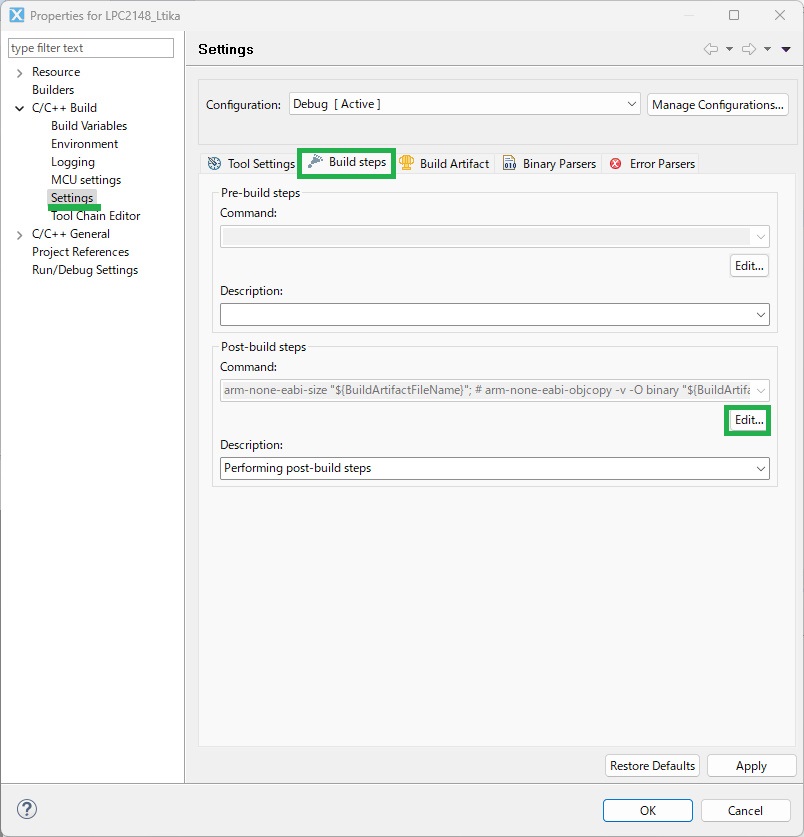 C/C++ Build の Settings を開き、上のタブのBuild Stepsを開きます。 Post-Build stepsのCommandのところにあるEdit… をクリック。