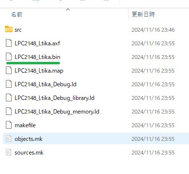 これで、コンパイルすると、binファイルが出力されます。