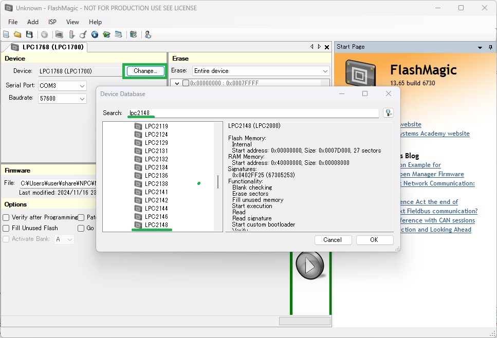 DeviceのChange…から、LPC2148と検索して、選択します。