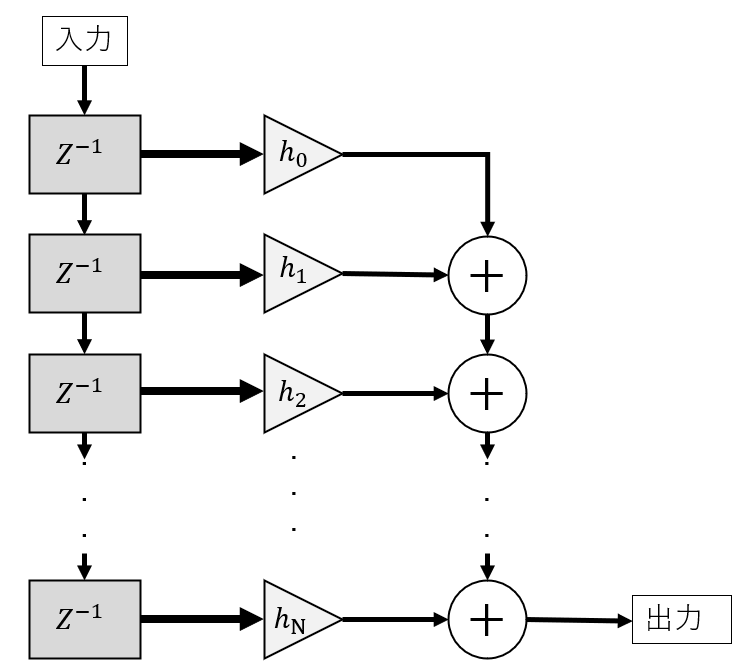 FIRフィルタでは、h0とかh1とかh2とかの数値(パラメータ)を調整するというのが目標になります。この値を変えることによって、指定されたローパス・ハイパス・バンドパスフィルタなどを作ることができます。