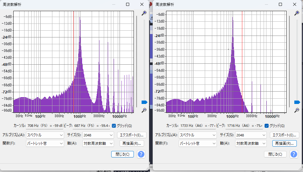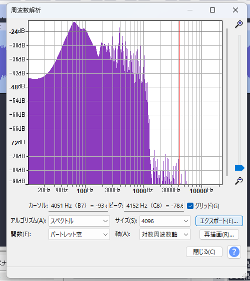 周波数解析の結果です。1000Hz~2000Hzを境に急に下がっていますね。完璧なフィルタです。