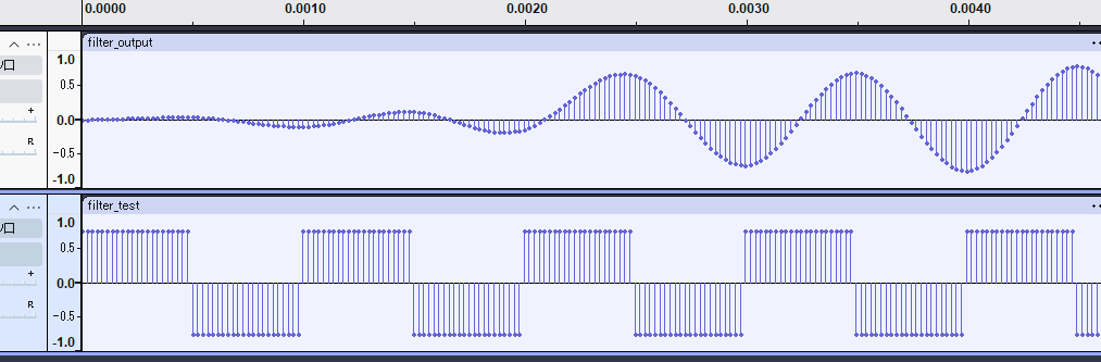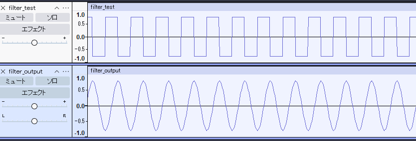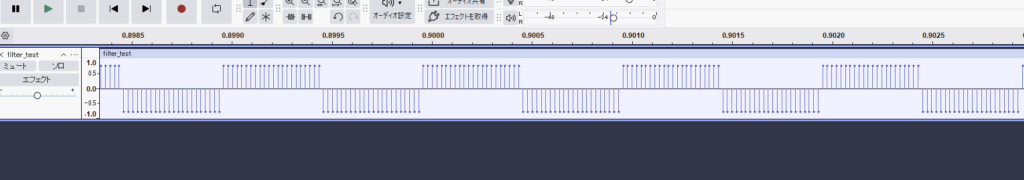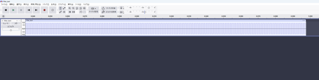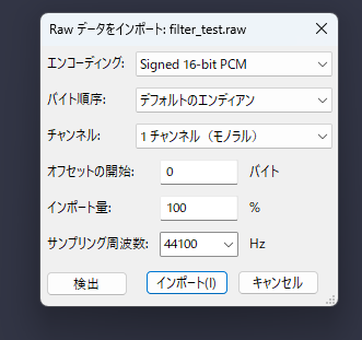 このプログラムを実行すると、フィルタ後のRAWデータが出力されます。先ほどと同様の方法でAudacityに読み込ませます。