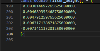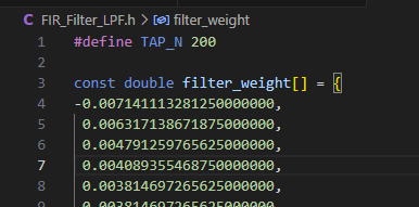 次に、配列を作ります。 const double filter_weight[]という配列名にしました。