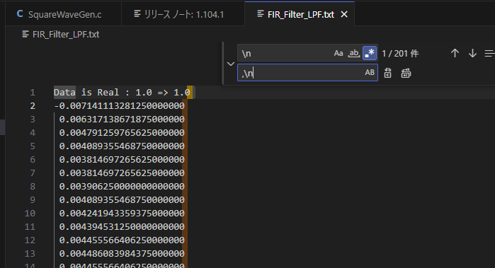 ここがVSCodeの便利機能なのですが、■*みたいなマークのところを押すと、\n等の改行文字も置換対象にすることができます。