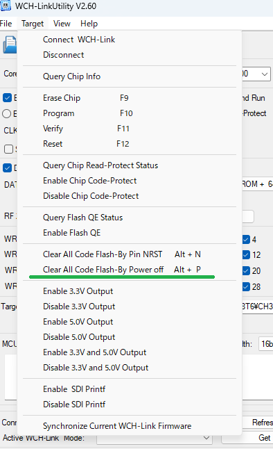 AFIO->PCFR1 |= AFIO_PCFR1_SWJ_CFG_2;再度書き込みする場合は、WCH-LinkUtilityにてTarget→Clear All Code Flash-By Power offを選択します。(メモリの中身が削除されて書き込めるようになります)