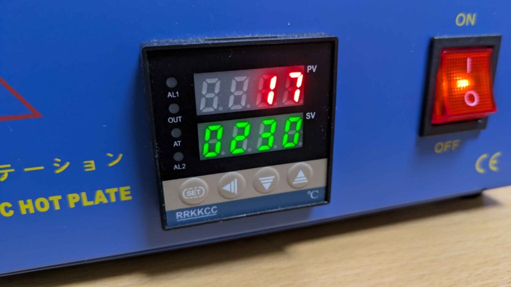 使い方は簡単で、SETボタンを押したら△のボタンで温度を上げるだけです。SV(緑色の方)が設定温度で、PV(赤色の温度)が現在の温度です。